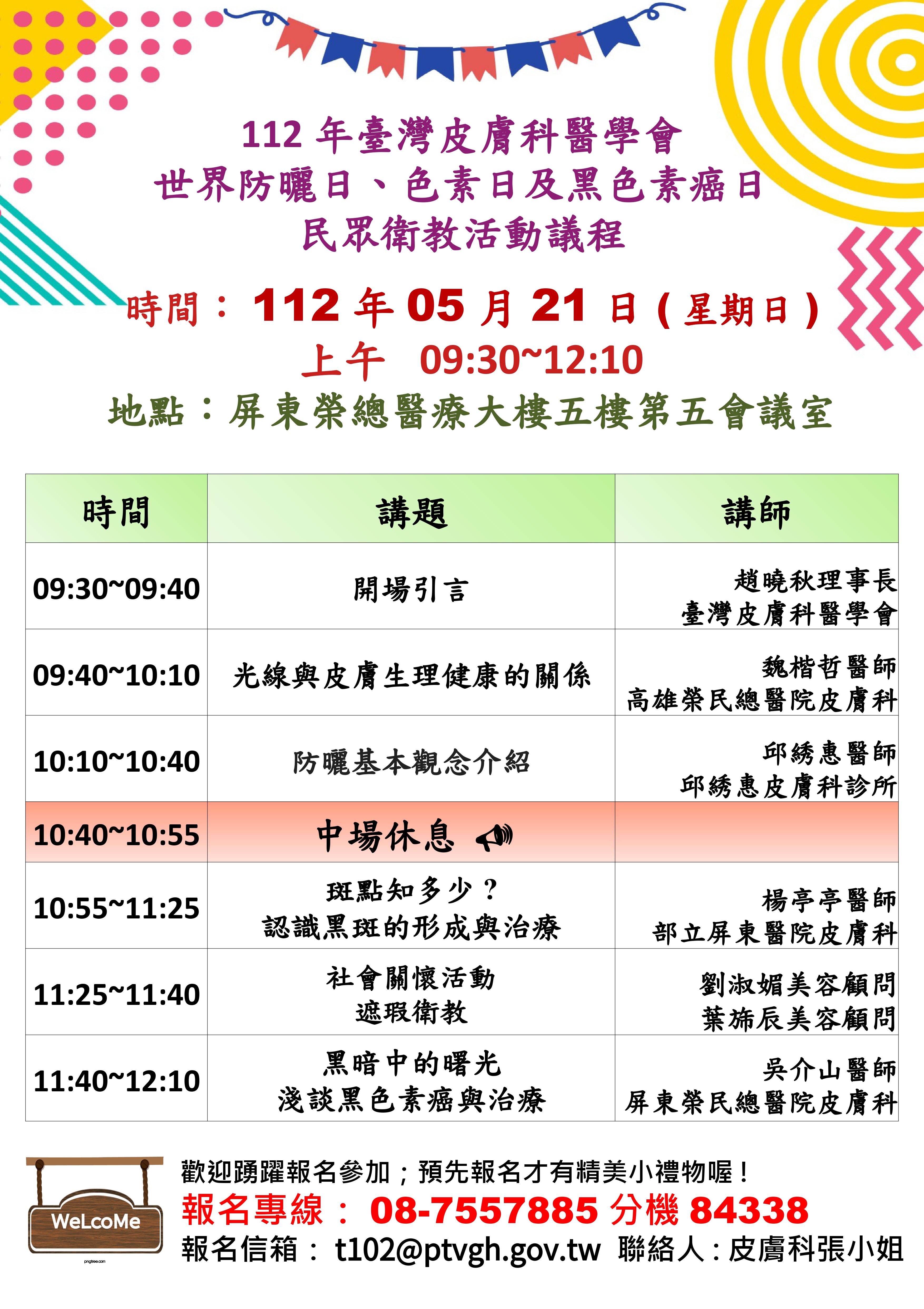學術活動 行事曆 本會繼續教育課程 春季會、年會 月會 其它繼續教育課程 業界演講 國際學術活動 活動報名 活動花絮 RSS訂閱 臺灣皮膚科醫學會世界防曬日色素日及黑色素癌日 2023/05/21 (日) 09:30 ~ 12:10 屏東榮民總醫院 5 樓第五會議室 本會繼續教育課程 加入Google行事曆 活動資訊 本會積分 其它繼續教育課程| 0 點 課程代號 主辦單位 臺灣皮膚科醫學會 協辦單位 屏東榮民總醫院皮膚科 申請單位 活動內容 一、主辦單位:臺灣皮膚科醫學會 二、承辦單位:屏東榮民總醫院皮膚科 三、時間:112年5月21日星期日9:30-12:10 四、地點:屏東榮民總醫院 5 樓第五會議室 五、主題:臺灣皮膚科醫學會世界防曬日色素日及黑色素癌日 六、報名電話:張小姐(08)7557885 #84332、報名信箱:t102@ptvgh.gov.tw 1120521皮膚科海報0516(A1海報) 聯絡資訊 聯絡人 張小姐 聯絡電話 (08)7557885 #84332 傳真 電子信箱 t102@ptvgh.gov.tw 分享: twitter facebook LINE Copy to clipboard 返回前頁