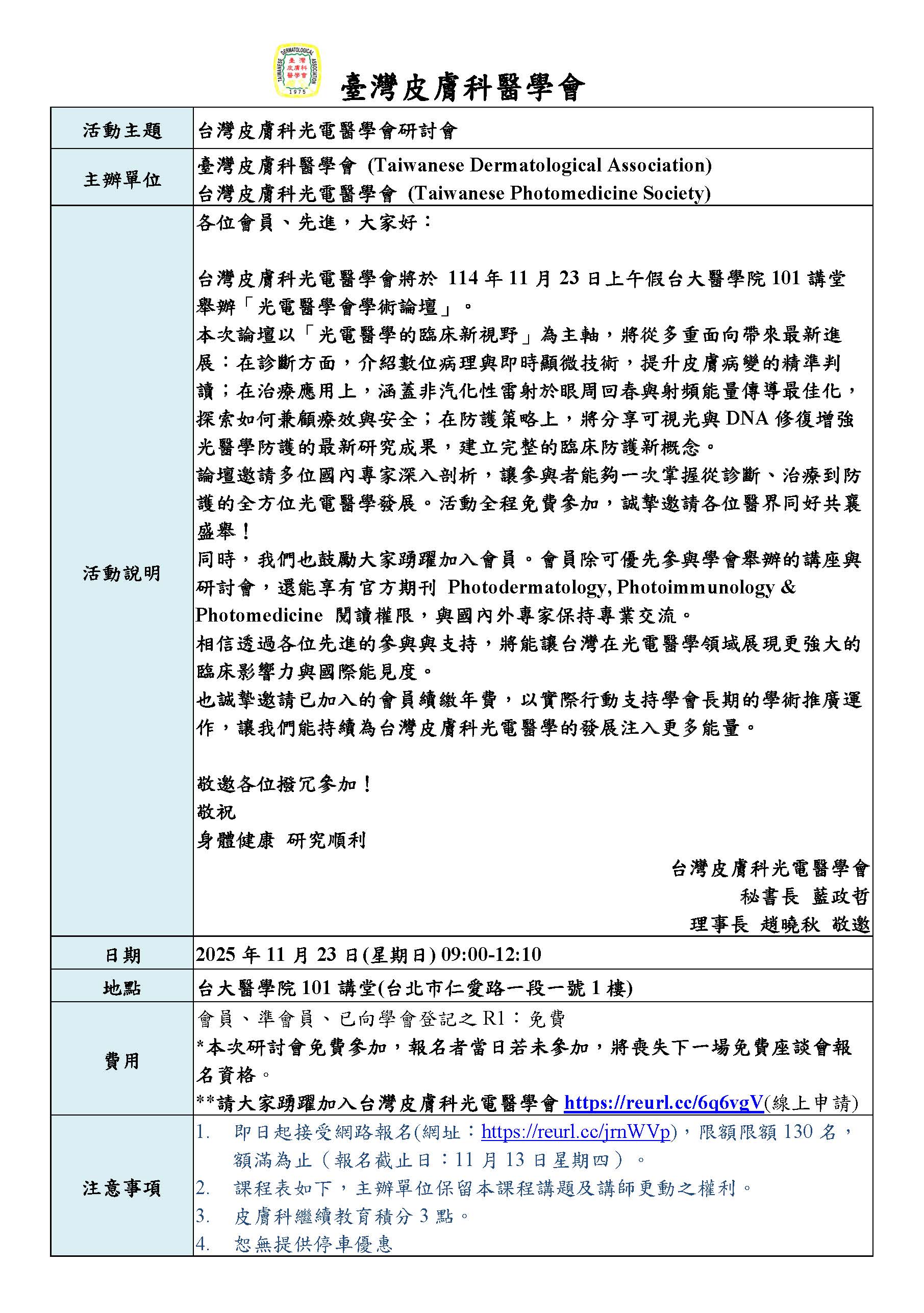 **請大家踴躍加入台灣皮膚科光電醫學會https://reurl.cc/6q6vgV(線上申請)