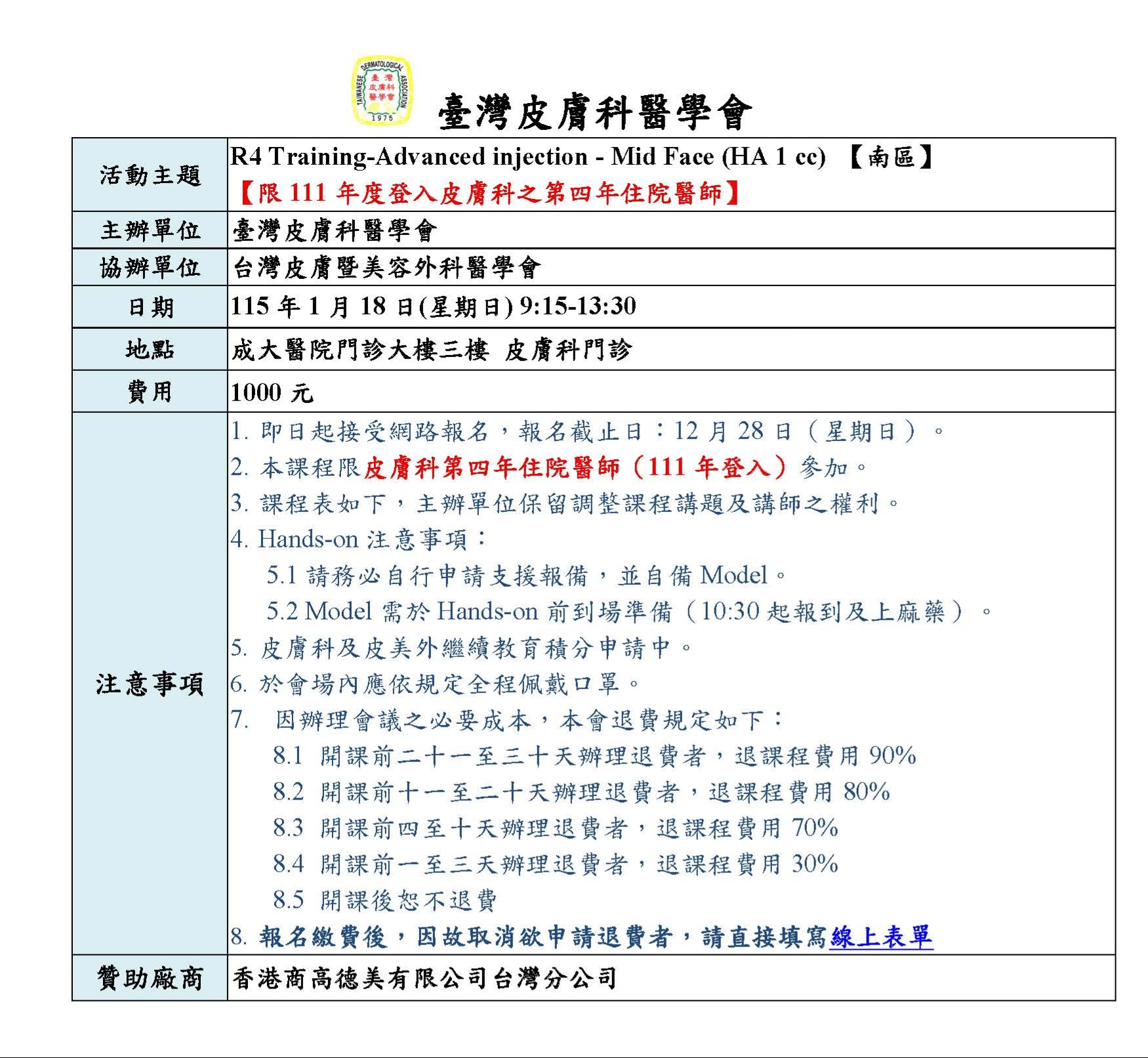 R4 Training-Advanced injection【南區】-【限111年度登入皮膚科之第四年住院醫師】