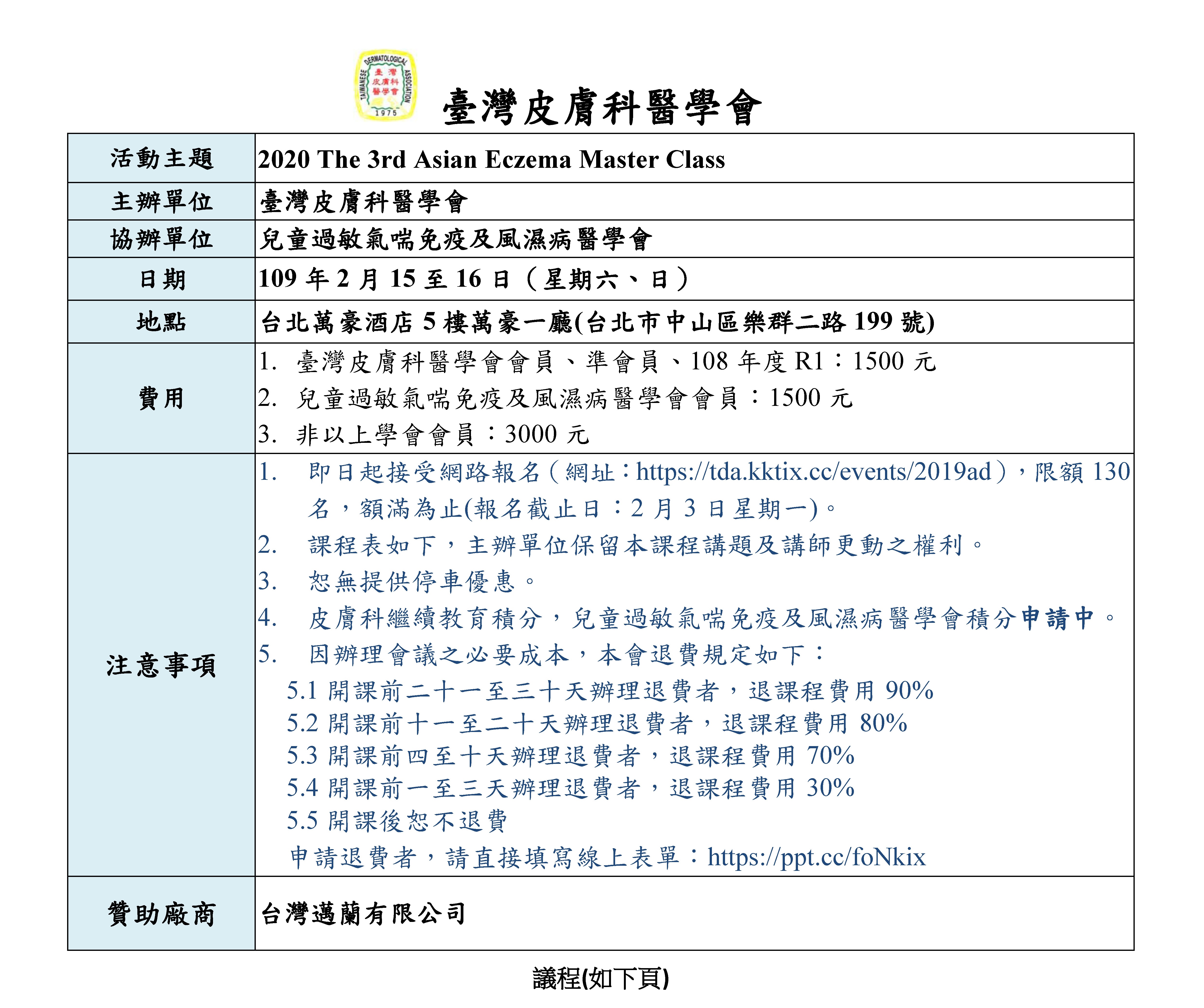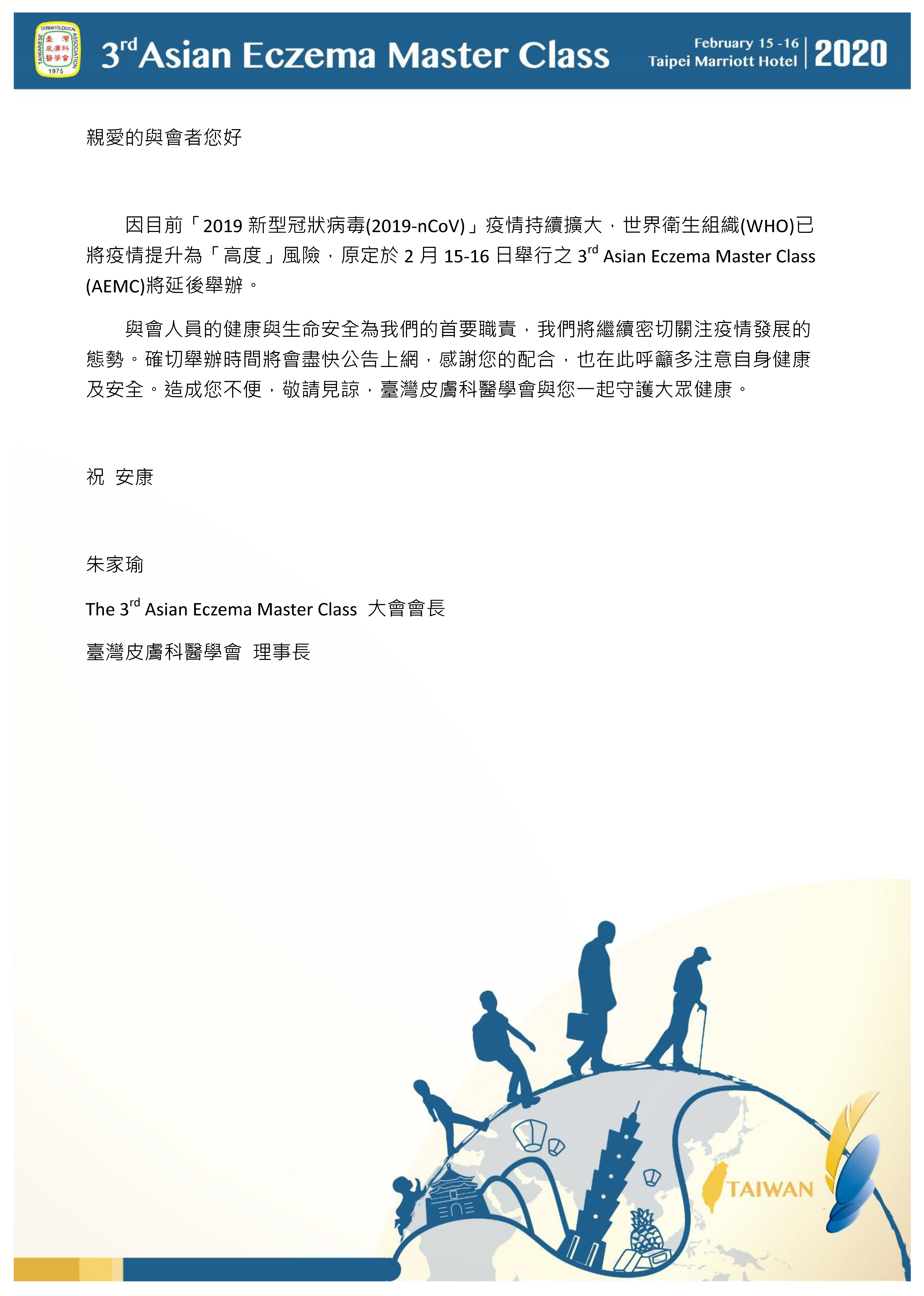 最新消息 秘書處公告 國際學術活動 國內學術活動 轉知訊息-政府機關 轉知訊息-其他單位 榮譽與獎勵 台灣兒童與青少年皮膚醫學會 臺灣皮膚醫學真菌學會 RSS訂閱 2020/01/02 國內學術活動 【會議延期】2020 The 3rd Asian Eczema Master Class (2020/2/15-16,台北萬豪酒店) 【會議延期公告】 2020021516aemc 分享: twitter facebook LINE Copy to clipboard 類別列表